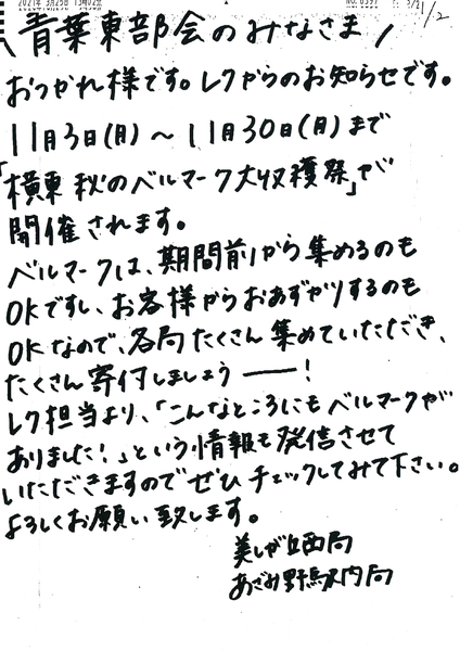 11月を収集期間、12月を仕分け・集計期間と定め、集中的に取り組む計画を立てました。名付けて「横東秋のベルマーク大収穫祭」。企画の中心を担ったのはレクリエーションのスタッフ16人です。イベントをより盛り上げるため、エリアごとの「部会」対抗で点数・枚数を競うことにしました。ただし、ルールは「強制せず、楽しみながら集めること」。