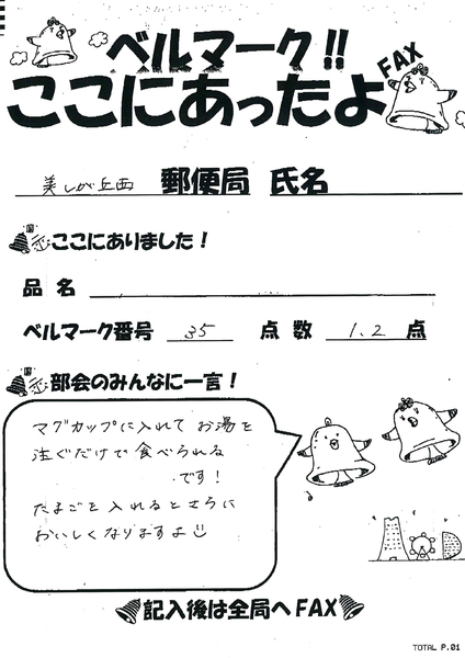 とは言え、呼びかけるだけではマークはなかなか集まりません。そこで「ベルマーク!!ここにあったよ」というプリントを作り、社員がベルマークを見つけた商品やその点数を記入してFAXで共有することにしました。プリントの一言欄には、その商品をおいしく食べるレシピや、お店のセール情報なども書き込まれ、運動を進める楽しさが増したそうです。