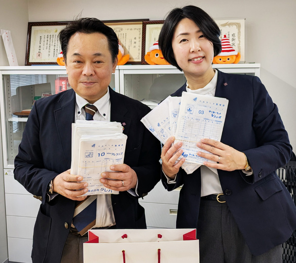 株式会社阪急阪神ホテルズ(本社・大阪市北区)が、都内と近畿圏の17のホテルの従業員から寄せられたベルマーク約7000点を財団に寄贈しました。昨年4月から今年3月までに集まった分で、寄贈は今回で3回目です。同社運営管理本部・首都圏課長の髙橋英行さん、中平千尋さんが3月25日、財団に届けてくれました。