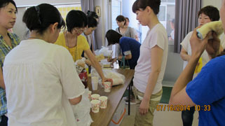 作業日は、午前中から蒸し暑い一日でした。広い集会室は、教室と違ってクーラーはありませんが、しっかり、「お茶当番」がいて、お茶、お菓子を用意。時々、「お茶のお代わりを」と水分補給を呼び掛けていました。扇風機が回っていても暑かったのですが、みなさん、真剣な面持ちで、しかし和気あいあいとお昼前まで作業をしました。