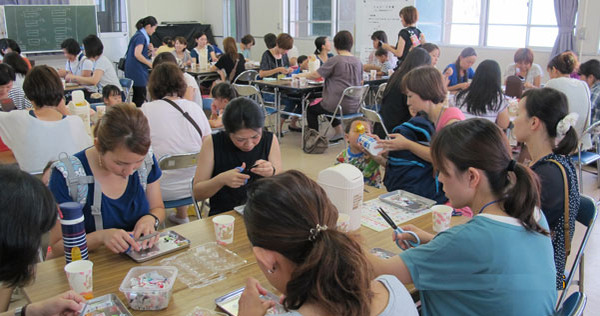 作業室となった集会室には、小さなお子さん連れもいて、9テーブルに7、8人ずつ座りました。