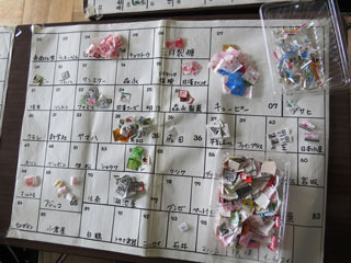 委員とボランティアが仕分け作業をするのは2カ月に一度です。今年度は5回集まりがあります。机の上に、協賛会社の番号と名前の入ったシートを置いて、そこでマークを分けていきます。マークがたくさん集まるキユーピーやフジッコ、味の素は枠が大きく取られています。キユーピーはマークが大きいので、特に大きな枠になっています。とても工夫されています。