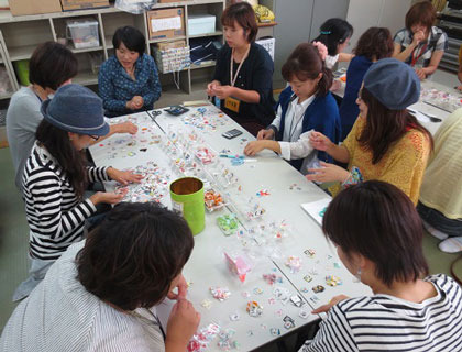 室内は畳式。数グループに分かれて、談笑しながら楽しく作業を進めています。同じ学年の保護者ということもあり、貴重な情報交換やコミュニケーションの場になっています。