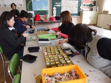 集まった多くのマークを仕分けしていきますが、仕分けのための容器がユニークです。4つの菓子箱の中に小さな小箱が25個ずつ並んでいます。それにベルマーク番号を付けて分けていきます。「クリスマスのいただきものの箱が可愛く、仕分けにぴったりと思ったので持ってきました」と4年目になる山地千寿子さん。