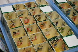 翌週月曜日、PTA会議室で協賛会社別、さらに点数別に仕分けます。ここからはPTA総務委員会(小滝=おたき=美沙委員長、11人)と保護者ボランティアの出番です。ボランティアは毎回募っていますが20人前後が参加、何回も協力する方もいるそうです。