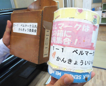 子どもたちは、家庭で集めたベルマークを随時、持参して、クラス内に設けられた回収箱に入れています。