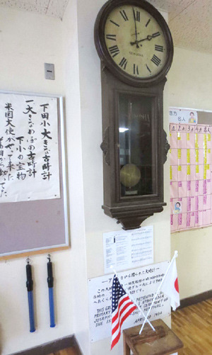 同小は1872(明治5)年に創立された歴史のある学校です。ペリー艦隊が1854(嘉永7)年の条約締結で来航して上陸した地に立つ記念碑から、北西に約500メートル離れた住宅街にあります。校歌にも、「米使ペリーの来航に鎖国の扉開かれて」とうたわれています。校内には、1934(昭和9)年に開かれた第1回黒船祭で、日米交流の「あかし」として米大使から同小に贈られた貴重な柱時計が飾られ、今も時を刻んでいます。