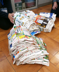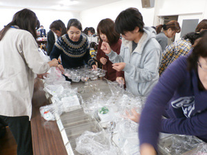 マークを引き継いだ厚生委員会は、各クラスから2人選出されて、総勢50人以上になります。学校の会議室を使って学年ごとにテーブルを囲んで仕分け、集計をしています。学区内のスーパーやコンビニ3カ所にも回収箱を置いて、地域の皆さんに協力を呼びかけています。