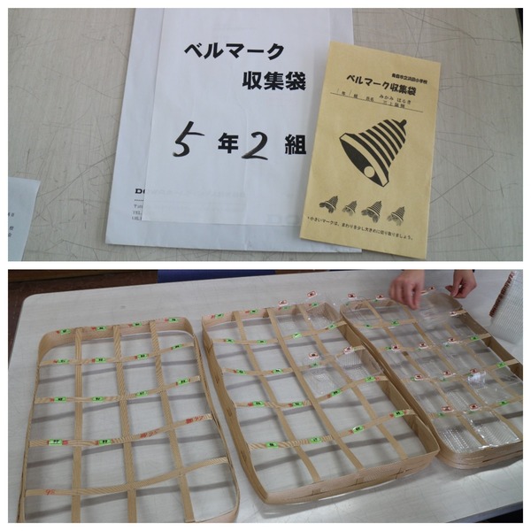 入学すると、児童に6年間使うベルマーク専用封筒を渡します。毎月15日の回収日に各クラスの担任がマークの入った封筒を集めて、クラス別の大きな封筒に中身だけを入れ替えて、職員室に置いてあるかごにまとめます。ベルマーク委員長の森山暁美さんは「先生方が協力的なので活動しやすい」と話します。